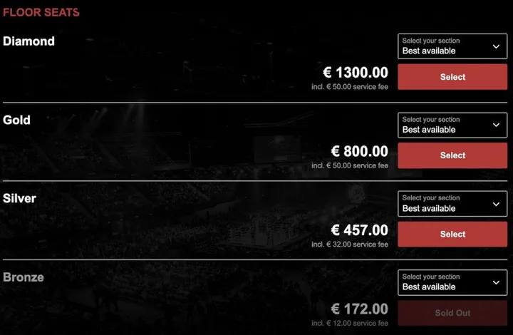De duurste tickets gaan momenteel weg voor 1300 EUR. Met deze Diamond-kaarten zit je dan wel helemaal vooraan. De goedkopere floor tickets kosten 107 euro, of acht tientjes als je iets hoger op de tweede rang wil zitten.